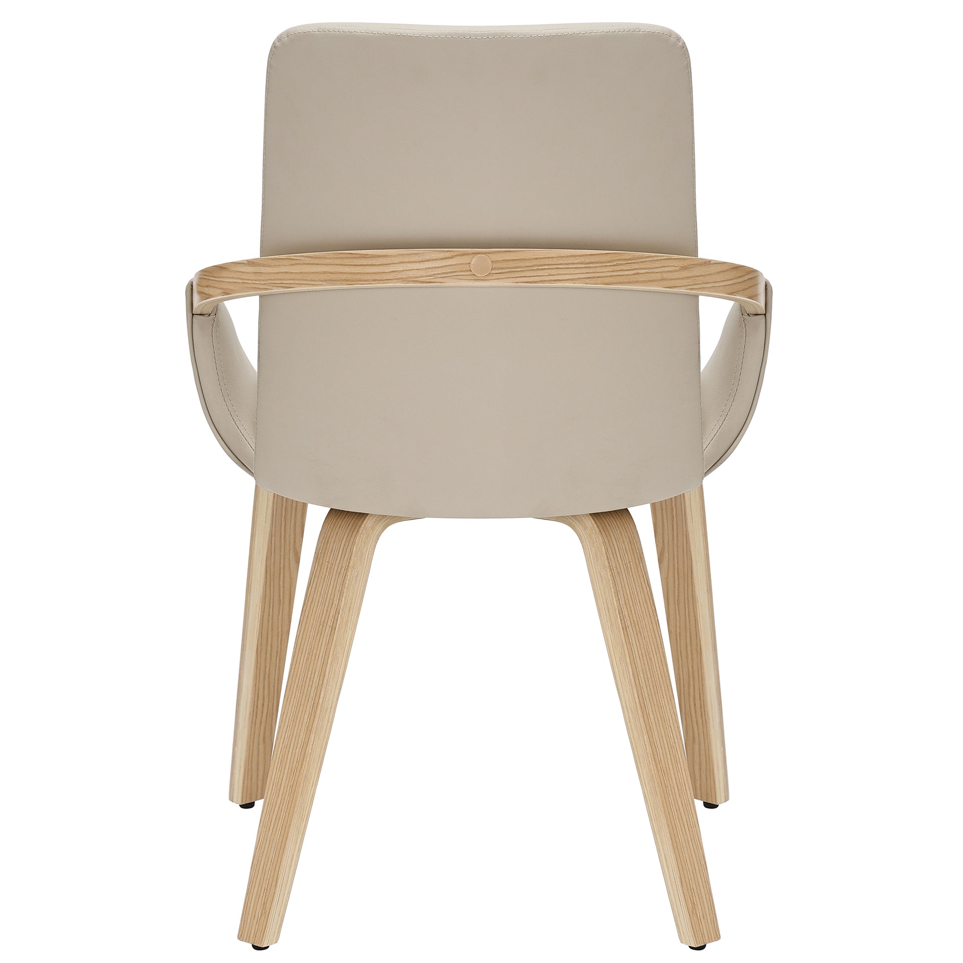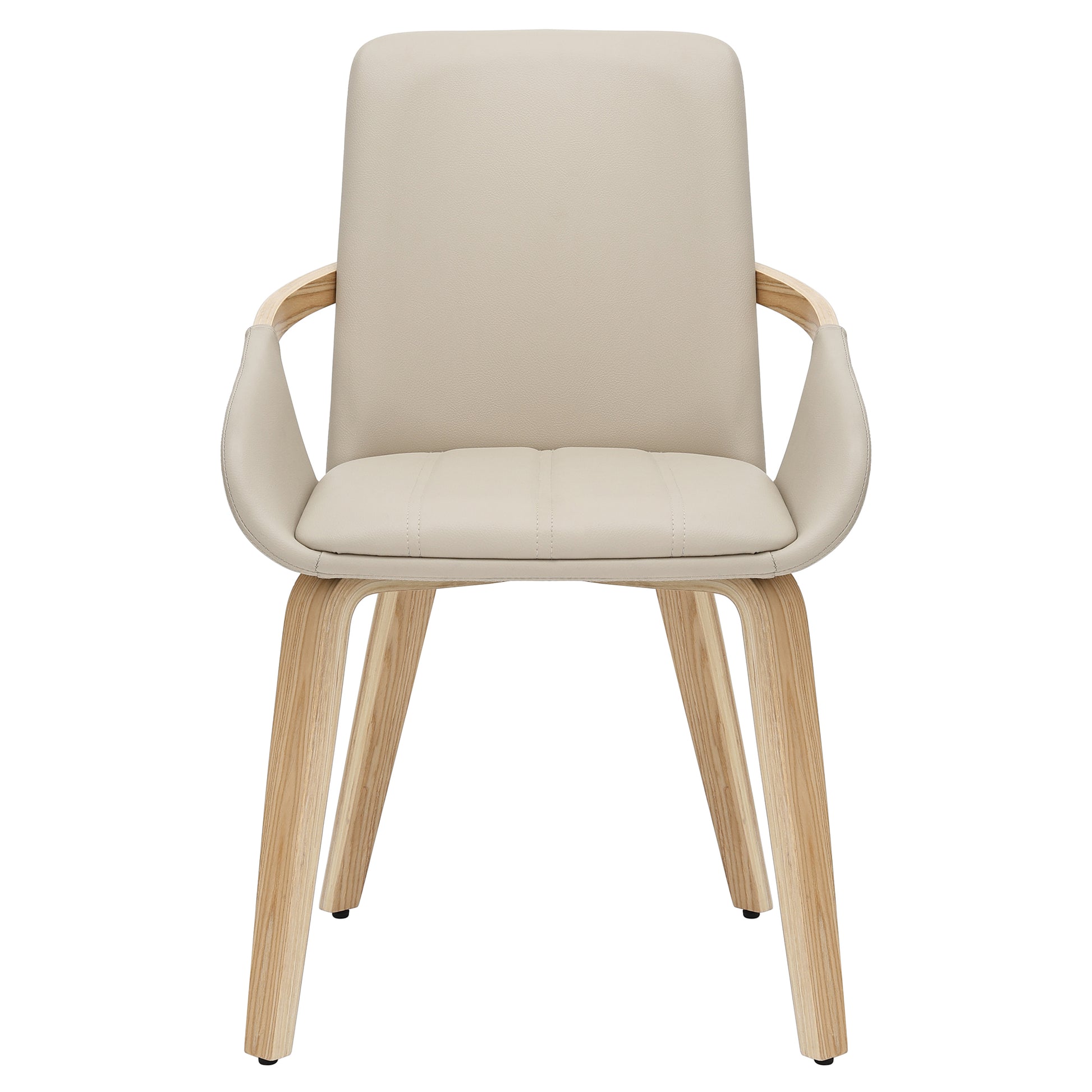 • Sand-toned faux leather upholstery with stitching details on seat cushion