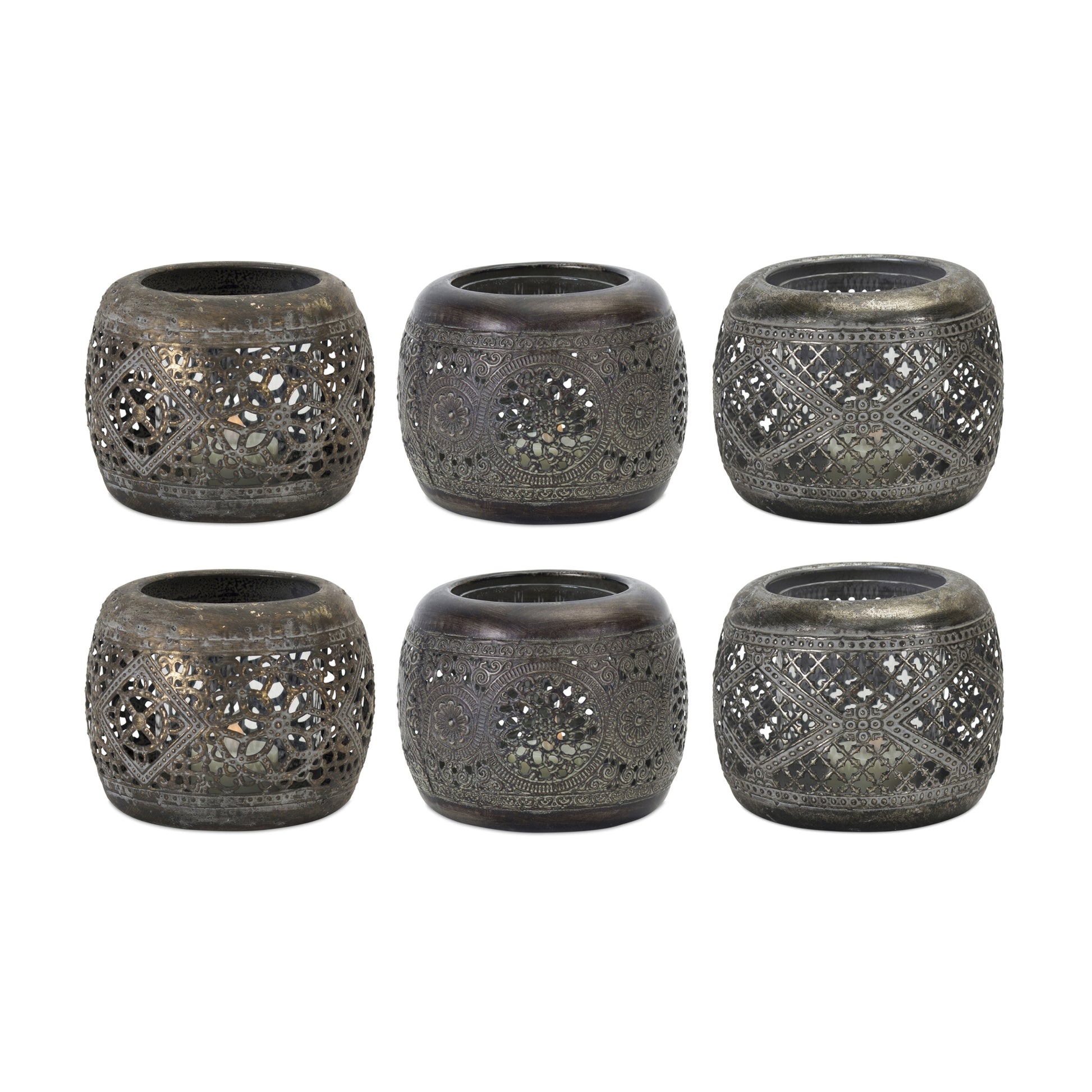 Add a zen touch to your home with this set of beautiful Metal Votive Holders. Featuring three assorted designs and six total candle holders, the ornate cut-out designs paired with the bronze metal finish is the perfect combination to create a stunning piece. Illuminate the set with real wax or LED candles. Candles sold separately.