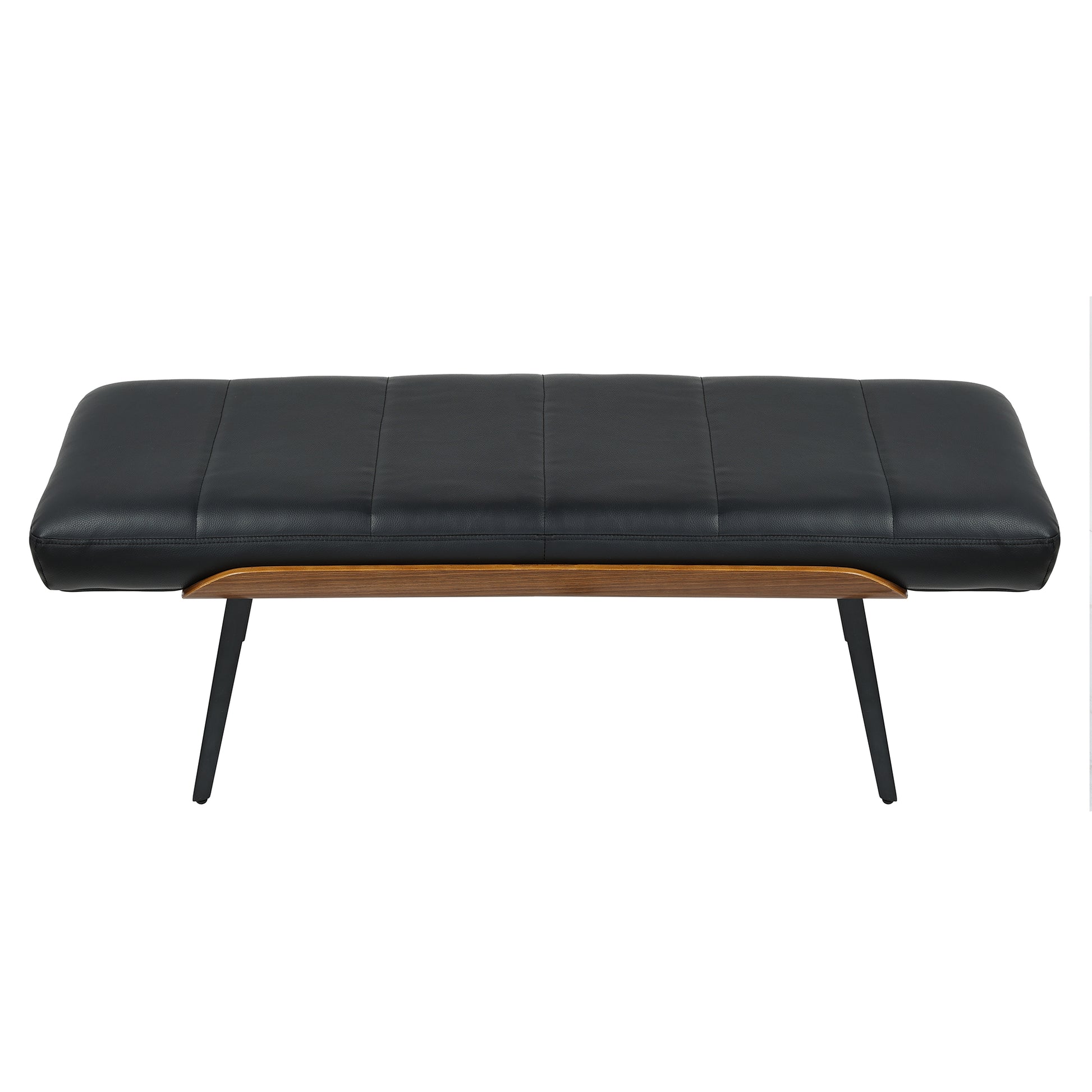 An easy bench to place in the hallway or entryway with the stitched black faux leather seat and black metal A-line legs. The solid bentwood frame in a walnut finish is a fun accent, adding some character to the clean-lined look. Comfortable seat cushion.
